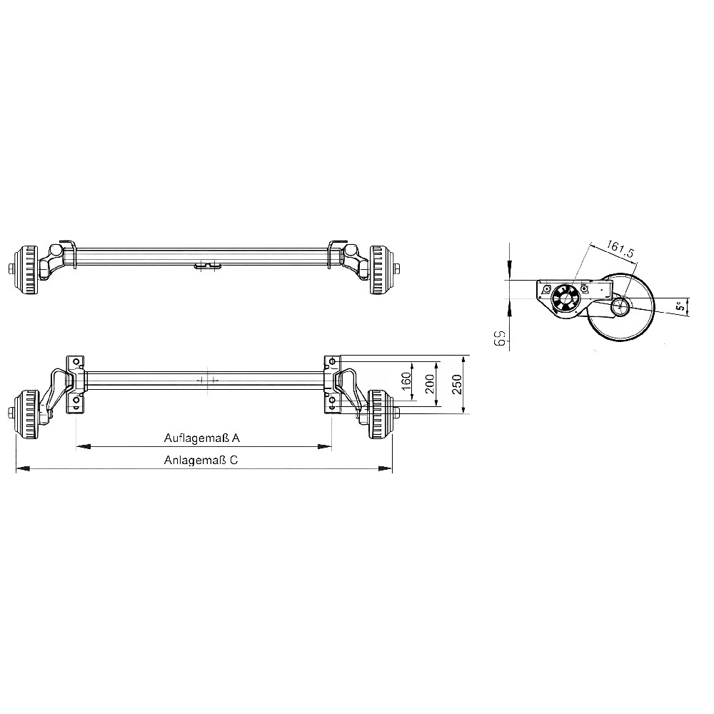 Alko-perävaunuakseli Compact, jarrutettu 1350 kg B1200-6, kiinnitys = 1100 mm, 5x112, 5°