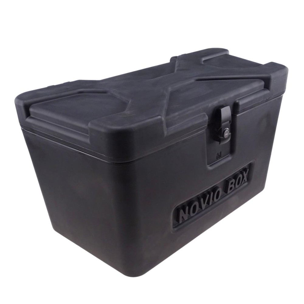 Edestä – musta säilytyslaatikko, jossa on lukittava kansi ja teksturoitu pinta.